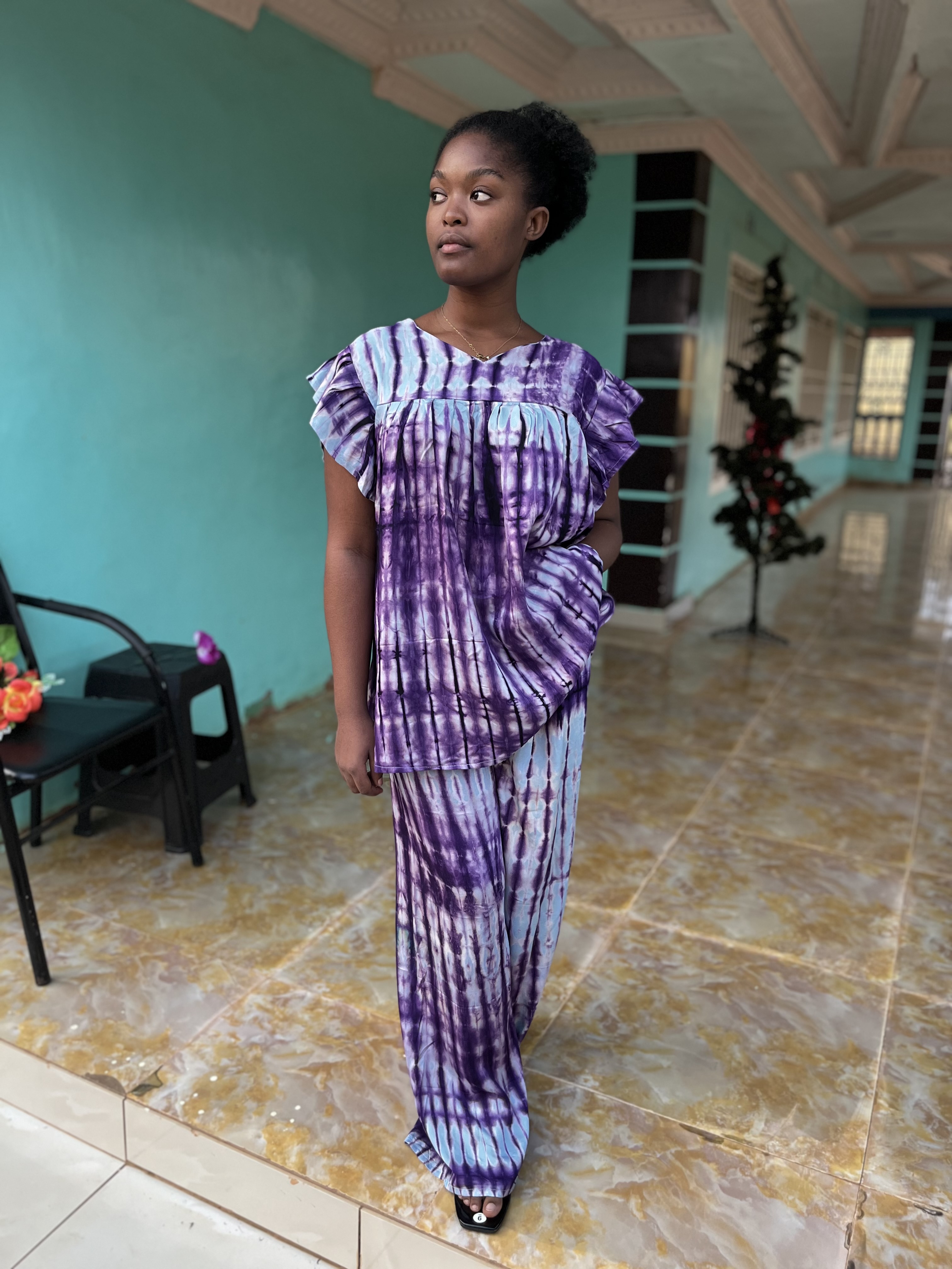 Ensemble fait main au Sénégal, composé d’un haut à manches volantées et d’un pantalon ample, au motif tie-dye violet et blanc. Élégant, confortable et unique.