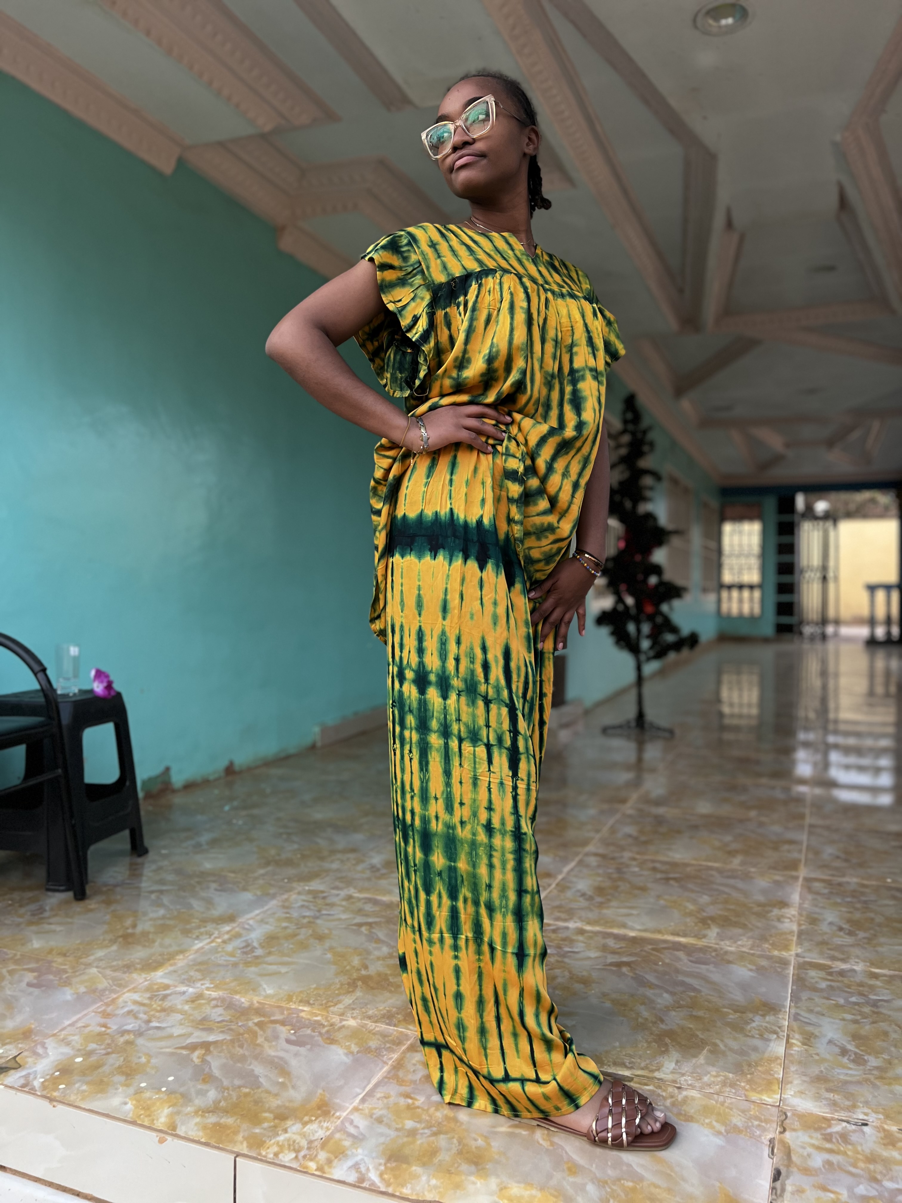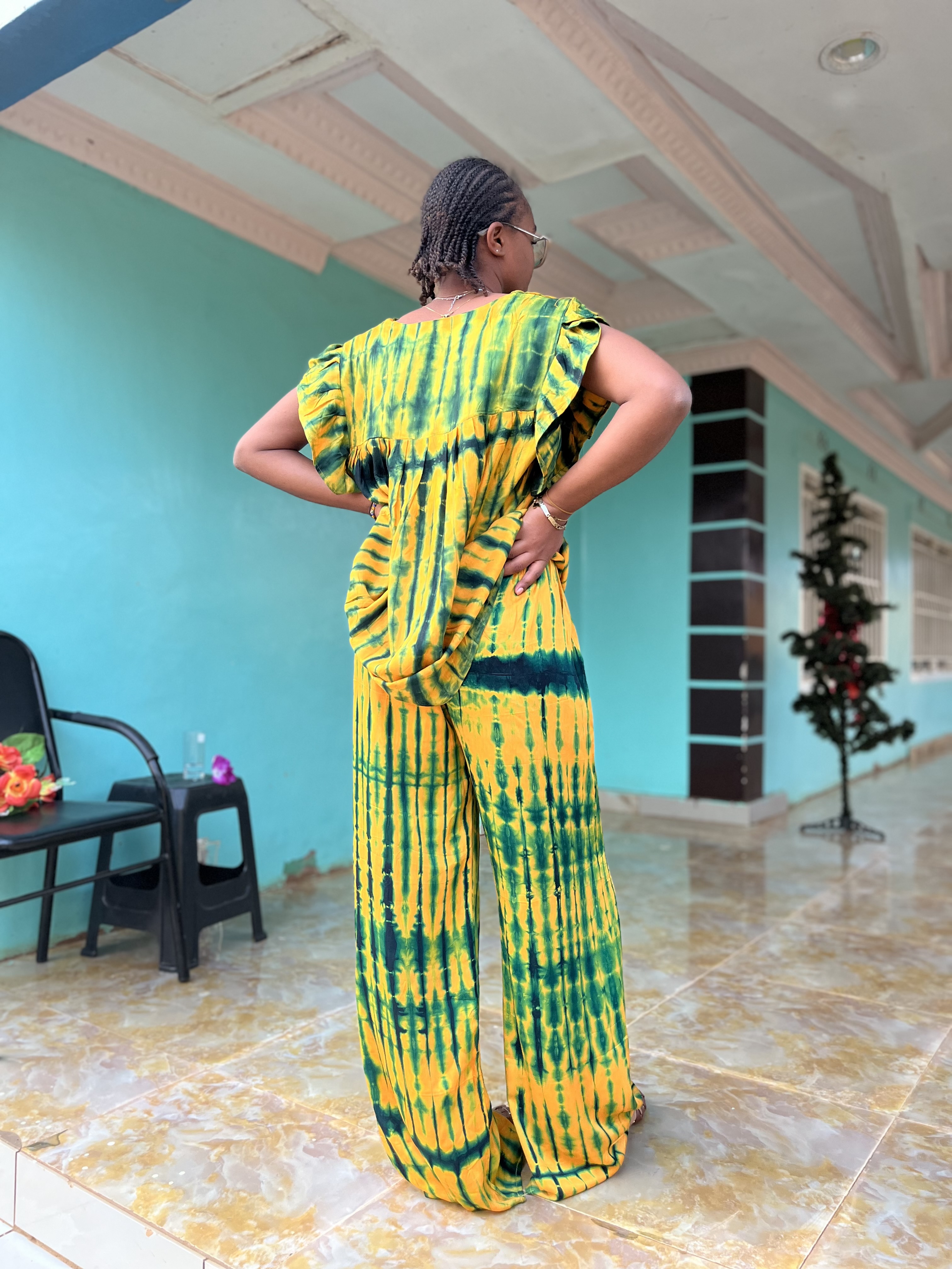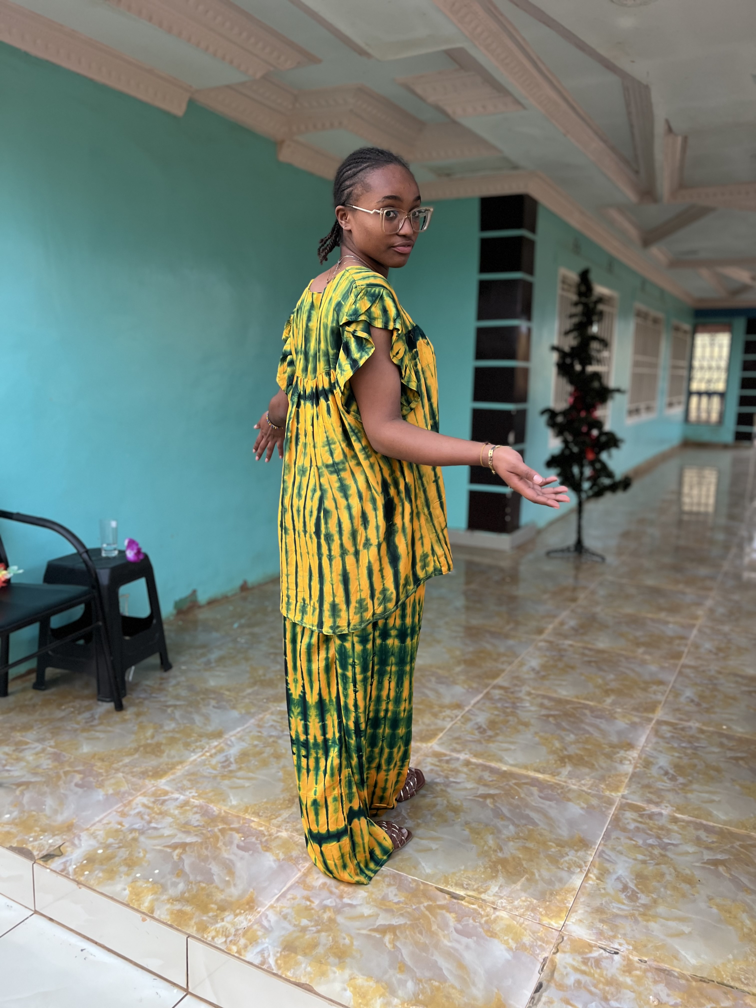 Ensemble fait main au Sénégal, composé d’un haut fluide à manches volantées et d’un pantalon large. Motif tie-dye rayé jaune et vert, pour un look vibrant et confortable.